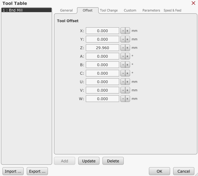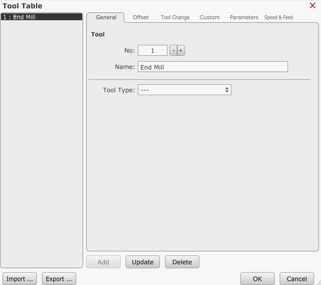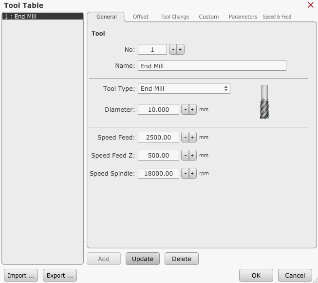 As mentioned earlier, consider the tool table as a repository of tools that your machine can employ for its daily machining tasks. To illustrate, let's take the example of an endmill tool, a commonly used tool that you'd like to designate as tool number 1.