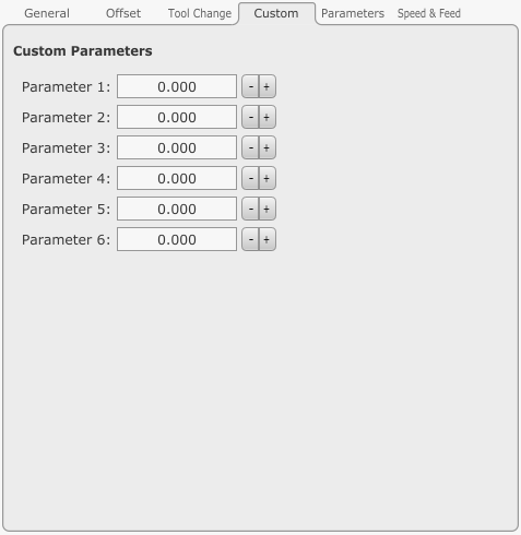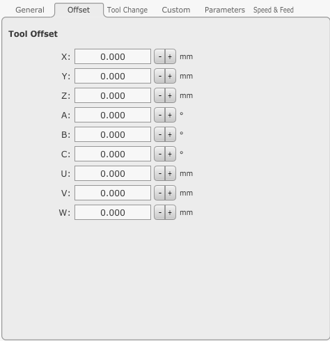 Each tool can get assigned many additional parameters located under tabs: Offset, Tool Change, Custom and Parameters.
