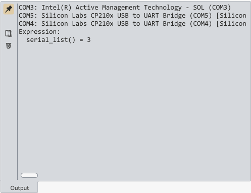 serial_list() - Displays all available COM ports of computer. serial_info(port) - Displays additional info of COM port of computer port - COM port name. Use string type ; e.g. "COM3" serial_open(port,baudrate,bits,parity,stopbits,flowcontrol) - Opens serial COM port channel and sets serial communication parameters port - COM port name. Use string type ; e.g. "COM3" baudrate - baudrate value, e.g. 4800bd ; 9600bd ; 19200bd ; 115200bd bits - data bits value, 5 ; 6 ; 7 ; 8 ; 9 data bits parity - parity value, 0 - no parity ; 1 - odd parity ; 2 - even parity stopbits - stop bit value , 0 - no stop bit ; 1 - one stop bit ; 2 - two stop bits flowcontrol - flow control value; 0 - no flow control ; 1 - flow control enabled Return value: Returned value is zero when port is successfully opened. Returned value is 1 when port has not been opened. Returned value is integer number. serial_config(port,baudrate,bits,parity,stopbits,flowcontrol) - Configures serial COM port channel communication parameters port - COM port name. Use string type ; e.g. "COM3" baudrate - baudrate value, e.g. 4800bd ; 9600bd ; 19200bd ; 115200bd bits - data bits value, 5 ; 6 ; 7 ; 8 ; 9 data bits parity - parity value, 0 - no parity ; 1 - odd parity ; 2 - even parity stopbits - stop bit value , 0 - no stop bit ; 1 - one stop bit ; 2 - two stop bits flowcontrol - flow control value; 0 - no flow control ; 1 - flow control enabled Return value: Returned value is zero when port is successfully configured. Returned value is 1 when port has not been configured. Returned value is integer number. serial_close(port) - Closes serial COM port channel port - COM port name. Use string type ; e.g. "COM3" Return value: Returned value is zero when port is successfully closed. Returned value is 1 when port has not been successfully closed. Returned value is integer number. serial_write(port,str) - Sends string type data trough serial COM port port - COM port name. Use string type ; e.g. "COM3" str - String type data that will be sent ; String data should be enveloped in quotes Returned value: Return value is data size. Returned value is integer number. serial_writedata(port,data) - Sends byte type data trough serial COM port port - COM port name. Use string type ; e.g. "COM3" data - Byte type data that will be sent Returned value: Return value is data size. Returned value is integer number. serial_writearray(port,hnd) - Sends array data trough serial COM port port - COM port name. Use string type ; e.g. "COM3" hnd - array handle Return value: Return value is data size. Returned value is integer number. serial_read(port,size,timeout(optional)) - Reads data trough serial COM port and prints it at the output window. port - COM port name. Use string type ; e.g. "COM3" size - data size limit to be read; 0 -> no limit in data size, 256 -> Max value of limit timeout - timeout value in milliseconds. After time has elapsed, COM port will not read any incoming data. This argument is optional. Return value: Return value is data size. Returned value is integer number. serial_readdata(port,size,timeout(optional)) - Reads data trough serial COM port and prints it at the output window. port - COM port name. Use string type ; e.g. "COM3" size - data size limit to be read; 0 -> no limit in data size, 256 -> Max value of limit timeout - timeout value in milliseconds. After time has elapsed, COM port will not read any incoming data. This argument is optional. Returned value: Return value is data size. Returned value is integer number. serial_readarray(port,hnd,size,timeout) - Reads data trough serial COM port and saves it to array port - COM port name. Use string type ; e.g. "COM3" hnd - array handle size - data size limit to be read; 0 -> no limit in data size, 256 -> Max value of limit timeout - timeout value in milliseconds. After time has elapsed, COM port will not read any incoming data. Return value: Return value is data size. Returned value is integer number.
