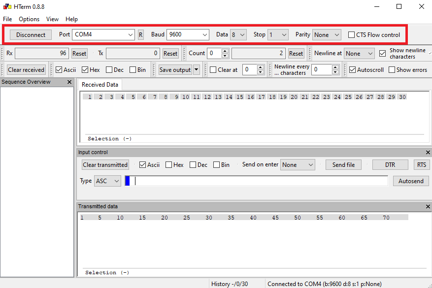HTerm terminal program is attached to COM4 port, communication parameters are set:
