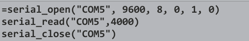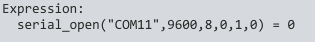 =serial_open("COM11",9600,8,0,1,0) ;baudrate at 9600 ;8 data bits ;1 stop bits ;none parity ;no flowcontrol