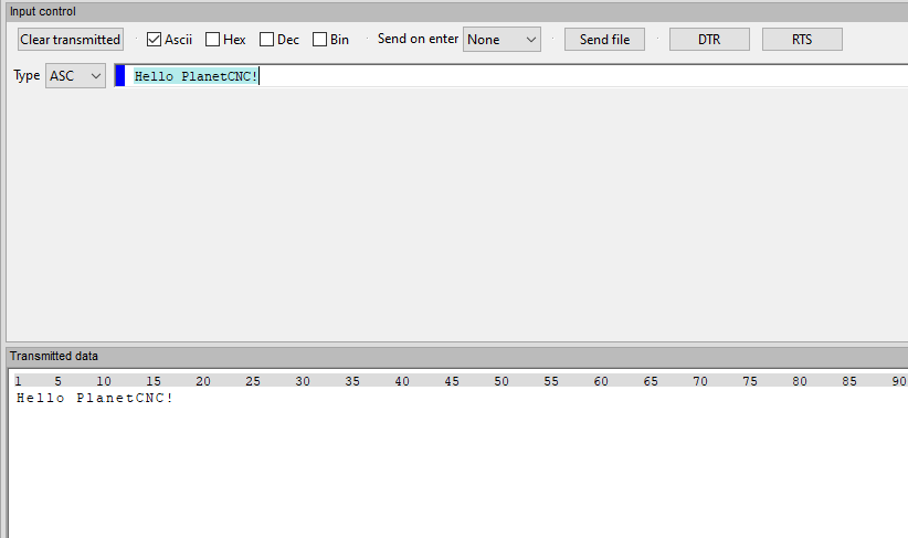Now its time for a simple serial communication example. For this we will use two COM ports, terminal program and PlanetCNC TNG software. Such approach is suitable for getting comfortable with array and serial functions on a somewhat real communication case.