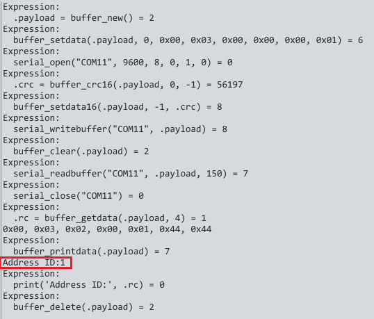 =.payload = array_new() array_setdata(.payload, 0, 0x00, 0x03, 0x00, 0x00, 0x00, 0x01) serial_open("COM11", 9600, 8, 0, 1, 0) .crc = array_crc16(.payload, 0, -1) array_setdata16(.payload, -1, .crc) serial_writearray("COM11", .payload) array_clear(.payload) serial_readarray("COM11", .payload, 150) serial_close("COM11") .rc = array_getdata(.payload, 4) print('Address ID:', .rc) array_delete(.payload)