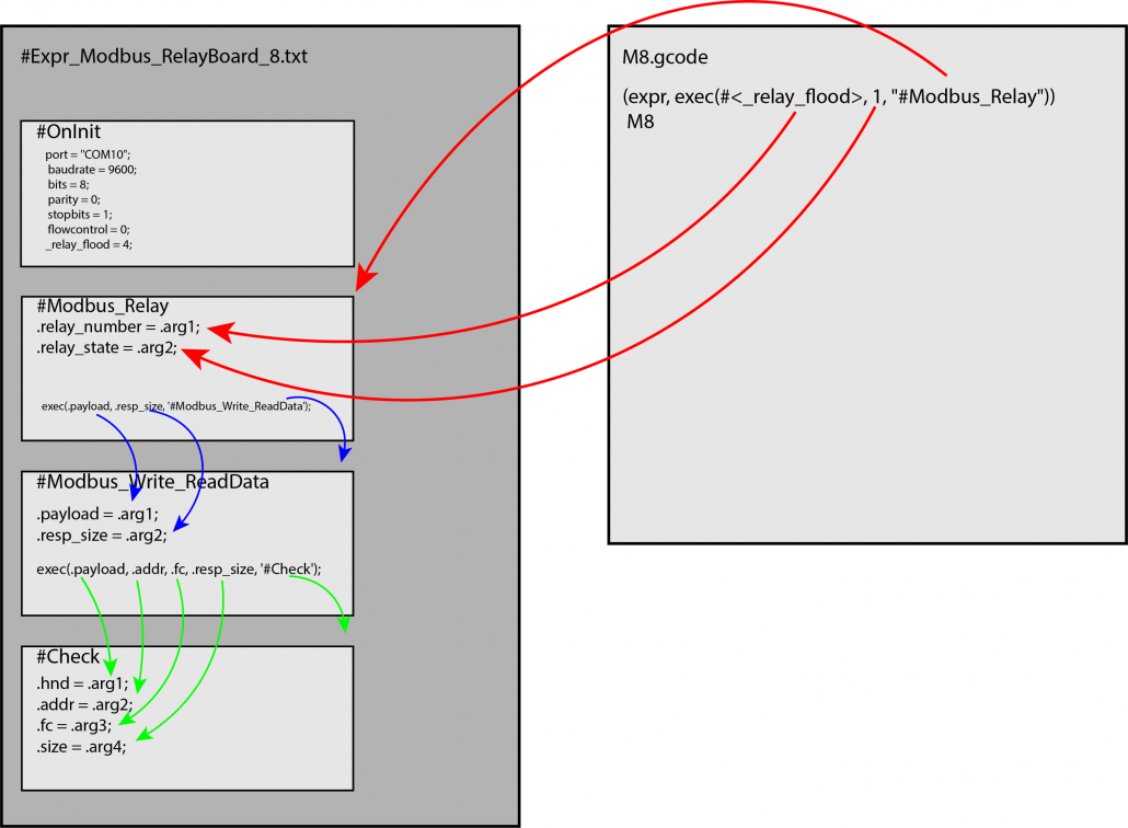In previous part we made two expression functions. One was responsible for turning relay ON the other one for turning it OFF. Our main concern was just to make it work, to see that relay clicks and that was it. Now we will try to do it the right way, using an efficient, structured and optimized code design. And to add to the complexity, we will use relay board as flood actuator, so that M8/M9 gcode command activates/deactivates relay 1 of Modbus relay board.