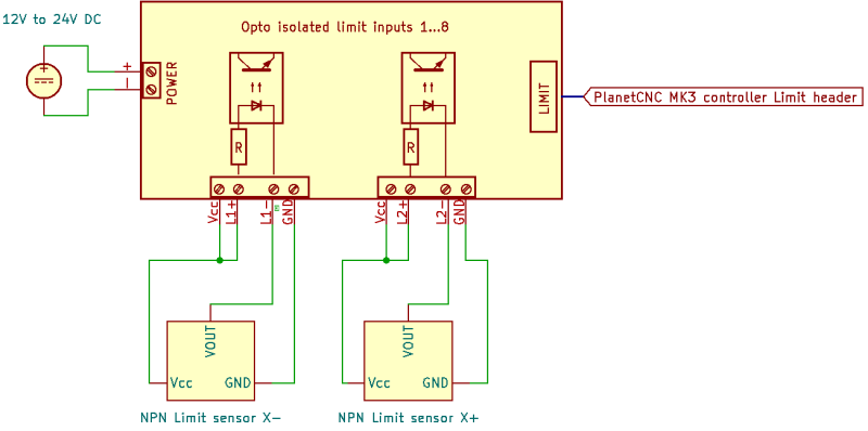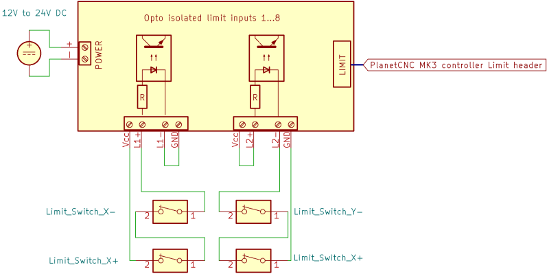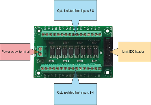 OptoIso Limit adapter is a device that opto-isolates Mk3 controller limit inputs from external devices such as limit proximity sensors, limit micro switches and similar devices.