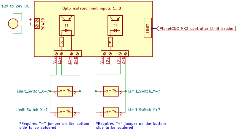 Instead of manually wiring the L- or L+ terminals of dedicated limit input, user can solder the jumper and achieve the same effect. For better explanation see connection diagrams in next chapter.