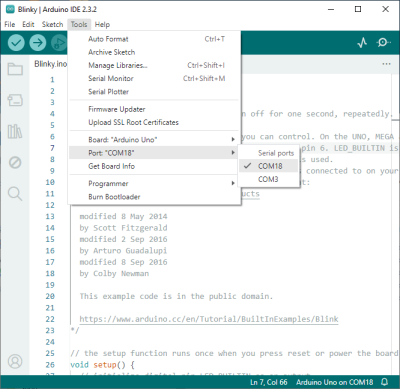 Select “Arduino board as programmer…” programmer, COM port and set baud rate to 19200