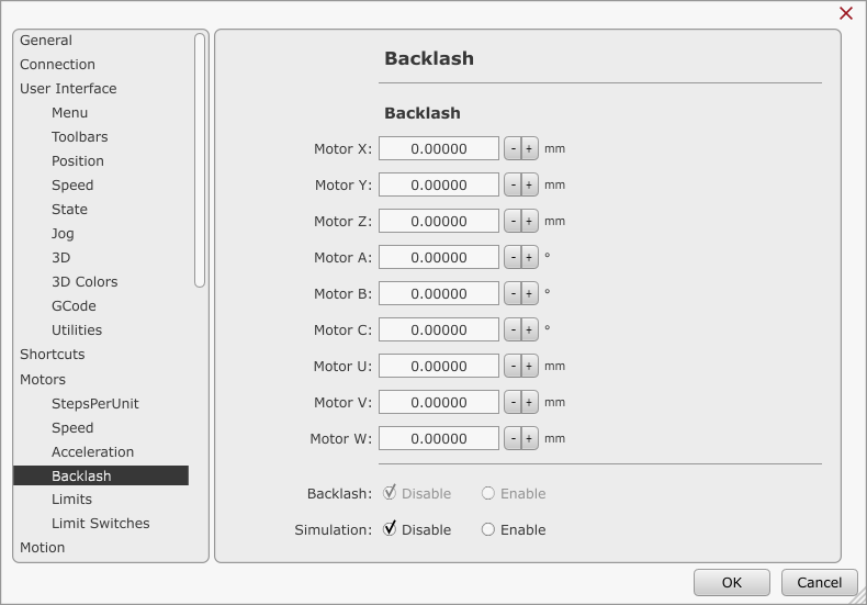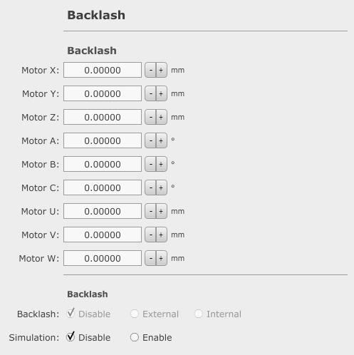 Set backlash compensation value if you machine has backlash. Units of backlash compensation values for linear axes are in mm or inch, for rotational axes are in degrees.